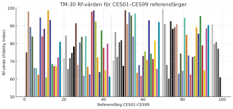- Lysrör och LED-lampor – Varierande CRI, men moderna LED-lampor kan uppnå CRI > 90 med förbättrad spektralfördelning.