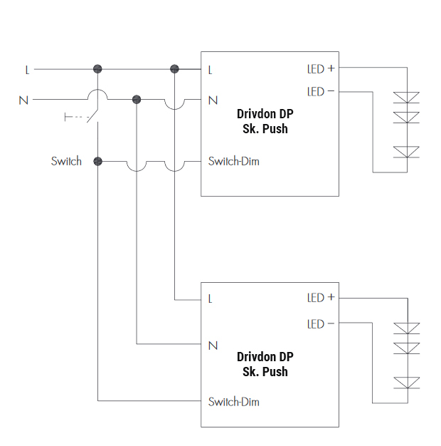 Drivdon av typen med push funktion dimrar ofta sin belysning jämnt och fint med hjäl pav en återfjädrande strömbrytare. Strömbrytare av de flesta fabrikat brukar ha sk. impulsfjäder som kan köpas som tillbehör och monteras bakom knappen. Nedan visar inkoppling av de flesta vanliga push drivdon.