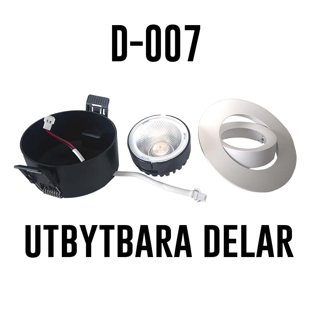 Utbytbar front till downlight i serie D-007 Söker du efter en downlight i guldutförande? Du kan enkelt skruva av och byta din front på din vinklingsbara downlight i D-007 serien