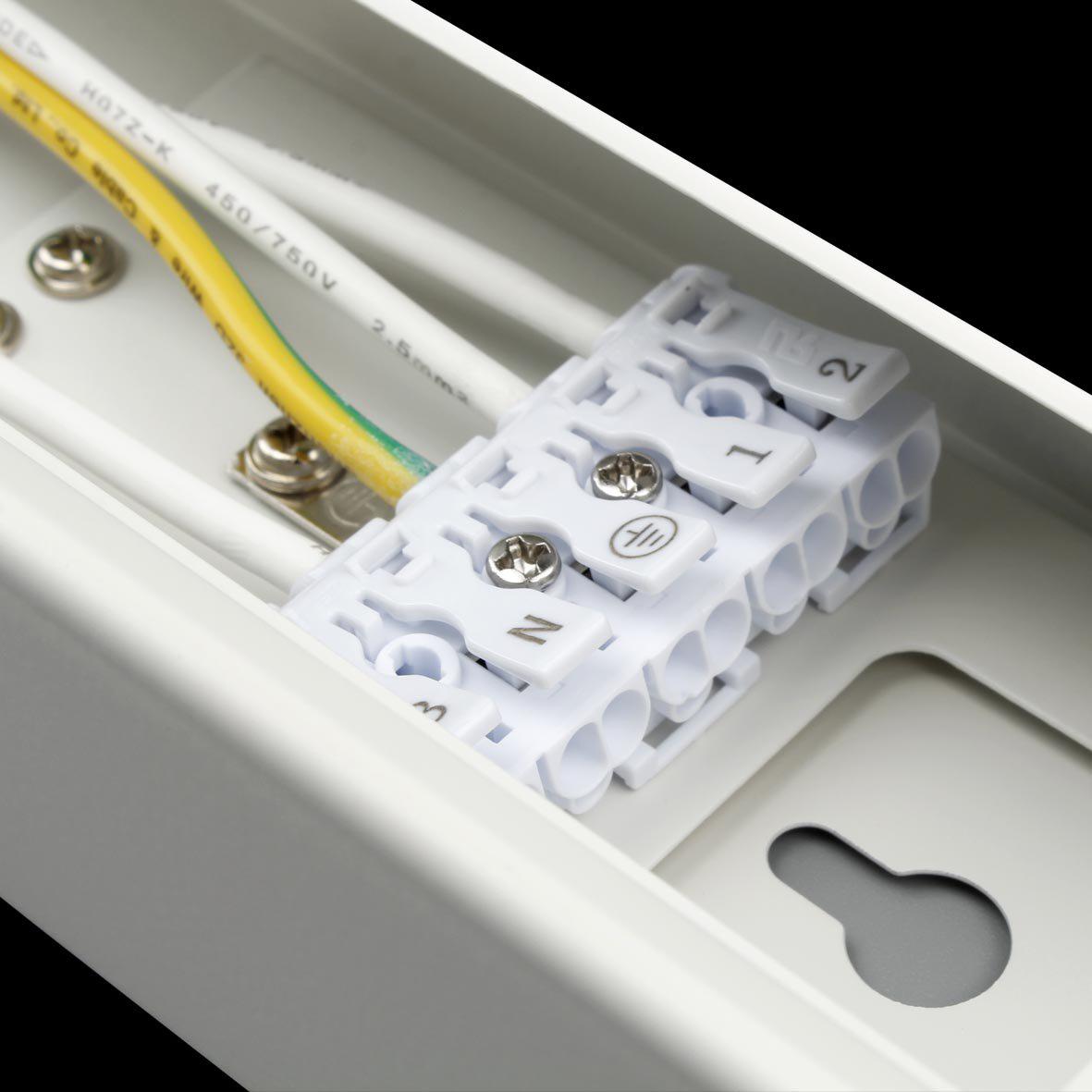 LINY Basic är överkopplingsbar och försedd med 5-poliga snabbplintar (5 × 2,5 mm²) placerade vid varje gavel. Gavlarna är verktygslöst öppningsbara och låses med magnet, vilket ger enkel åtkomst vid installation och service.