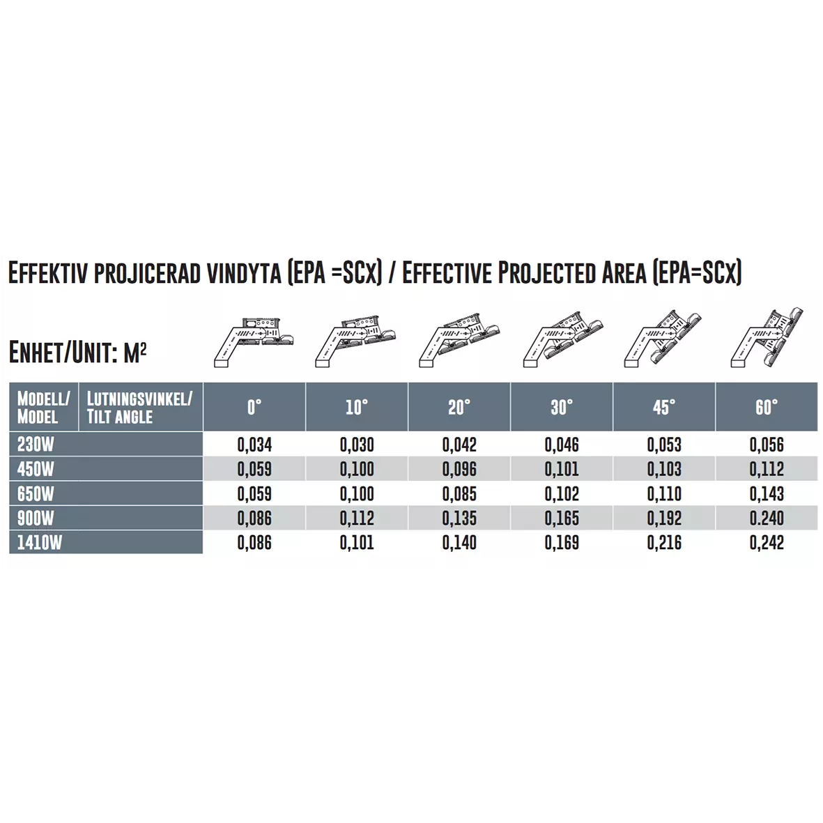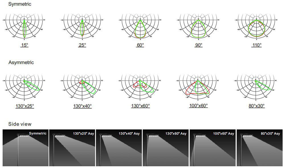 Serien armaturer är komplett för att kunna erbjuda belysning för de flesta större objekt. Allt från skruv till tätningar är framtaget för att kunna monteras i Sveriges hårda klimat. Med framåtriktade, asymmetriska spridningsvinklar kan man med dessa armaturer uppnå en lägre projicerad vindyta (EPA). Detta i kombination med lättviktsmaterial är en fördel vid beräkning av vilken mast samt fästen som behövs. Spridningen går att justera men standard är assymmetrisk spridning 130×25 grader. Med denna typ av lins ger armaturerna följande lumenvärden. Power Spridningsvinkel