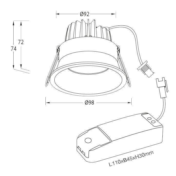 Ljuskällan är försänkt långt in i armaturen vilket minskar risken för bländning. Två utbytbara reflektorer medföljer som enkelt kan bytas till önskad spridningsvinkel. IP44 möjliggör användning även i badrum eller i takfot utomhus. Dimbar. Inkl. drivdon. Får ej monteras mot brännbart material eller övertäckas av isolering, utan skyddskåpa.